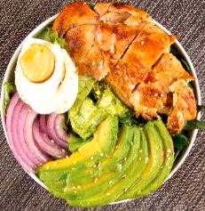 Ensalada con Espinaca, Lechuga, pechuga de pollo, ajonjolí, aguacate, cebolla cabezona, huevo cocido y vinagreta