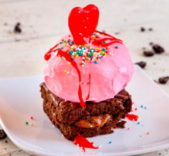 Brownie, helado dulce de colores y salsa de fresa