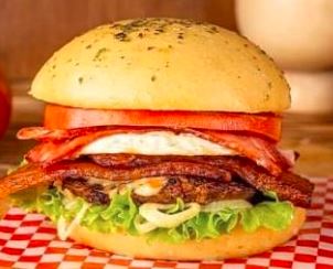 Hamburguesa de 150 Gramos de carne de res artesanal, 1 huevo frito, plátano maduro, queso, tocineta, lechuga, tomate y salsas, tomate, rosada.
