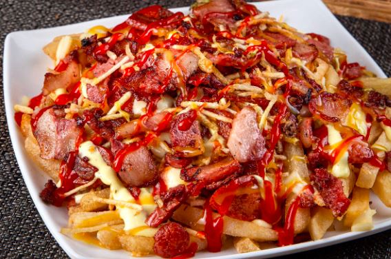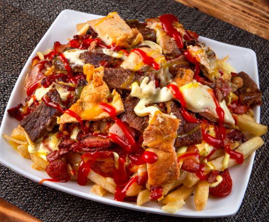 Salchipapa con Salchicha, papa ripio, tocineta y carne, pollo.