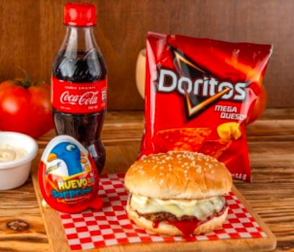 Hamburguesa de 100 Gramos de carne de res artesanal, queso, huevo, sorpresa, doritos y gaseosa personal Coca - Cola.