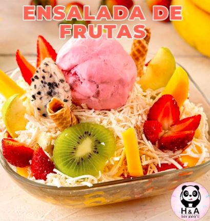 Ensalada con Banano, papaya, manzana, piña o mango, crema de leche, queso, galleta, salsa de fresa y 2 bolas de helado.