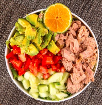 Ensalada con Lechuga, Tomate, Atún, Limón, Aguacate, pepino cohombro y vinagreta.