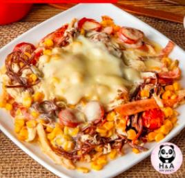 Mazorcada con Maíz tierno, chorizo, salchicha, pollo, carne de res desmechada y queso.