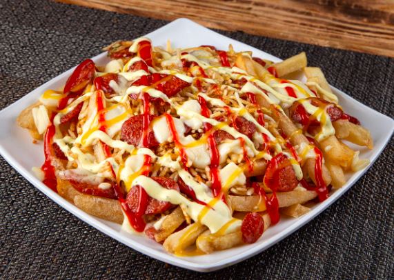 Salchipapa con Salchicha, papas ripio, salsas de tomate, rosada y queso.