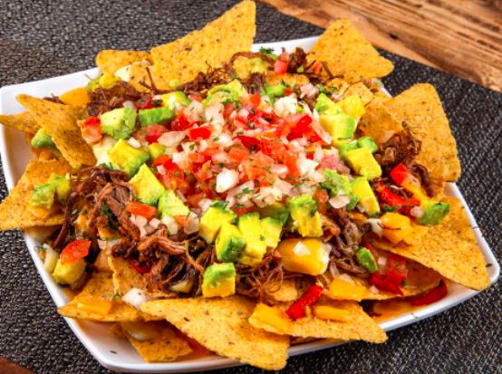 Nachos, carne desmechada, pimentón, pico de gallo, queso cheddar, queso doble crema, salsa picante, aguacate y salsas, tomate, rosada.