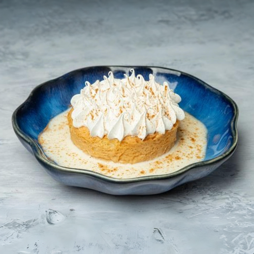 Torta personal jugosa de bizcocho empapado en tres leches, coronada con chantilly ligero y canela espolvoreada.