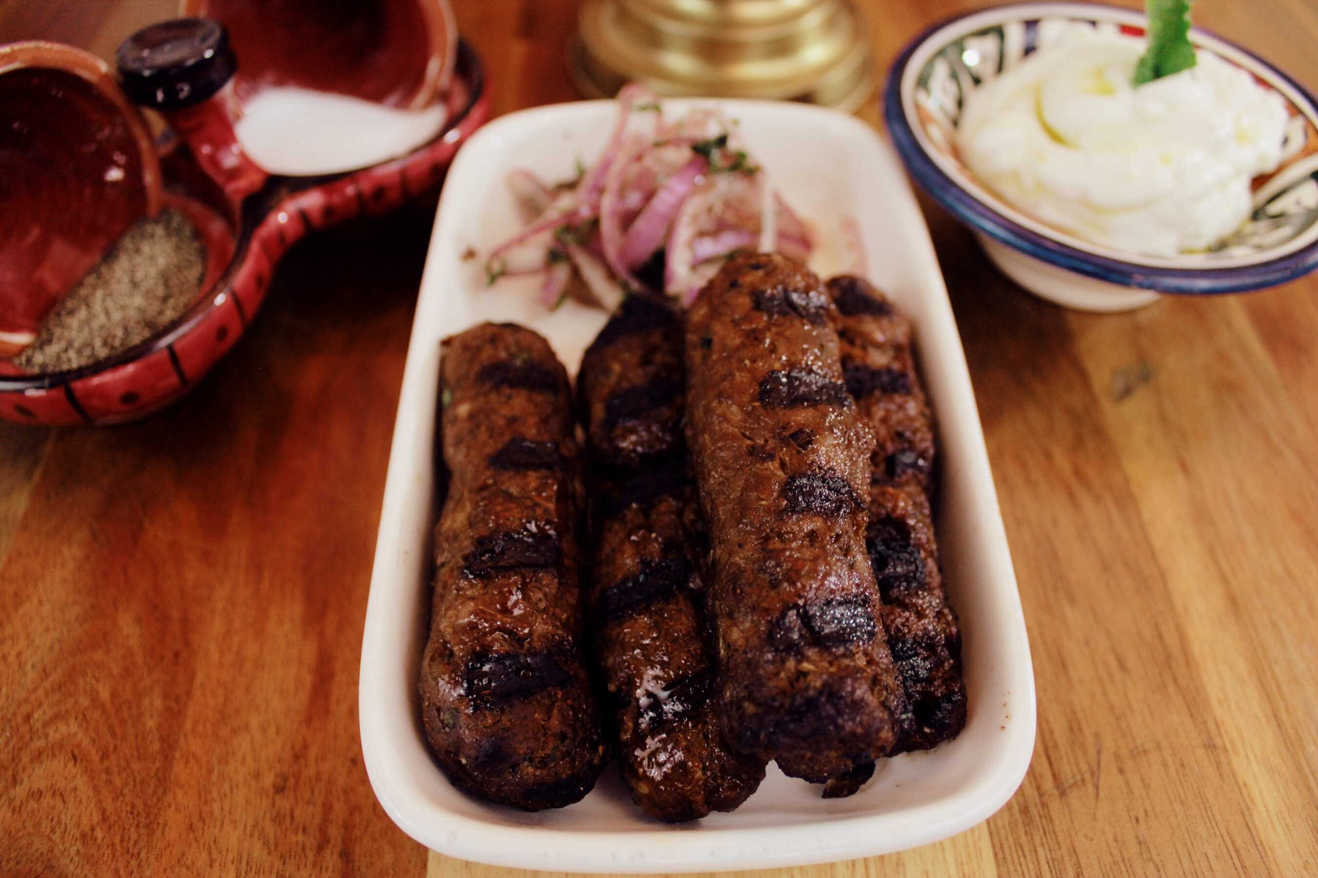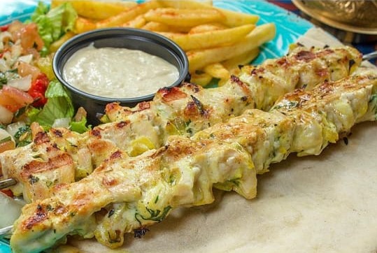 Cuatro chuletas de cordero asadas, 1 pincho de pollo, 1 pincho de carne, 4 kufta, hummus y salsa de ajo. Acompañado de pita y ensalada.