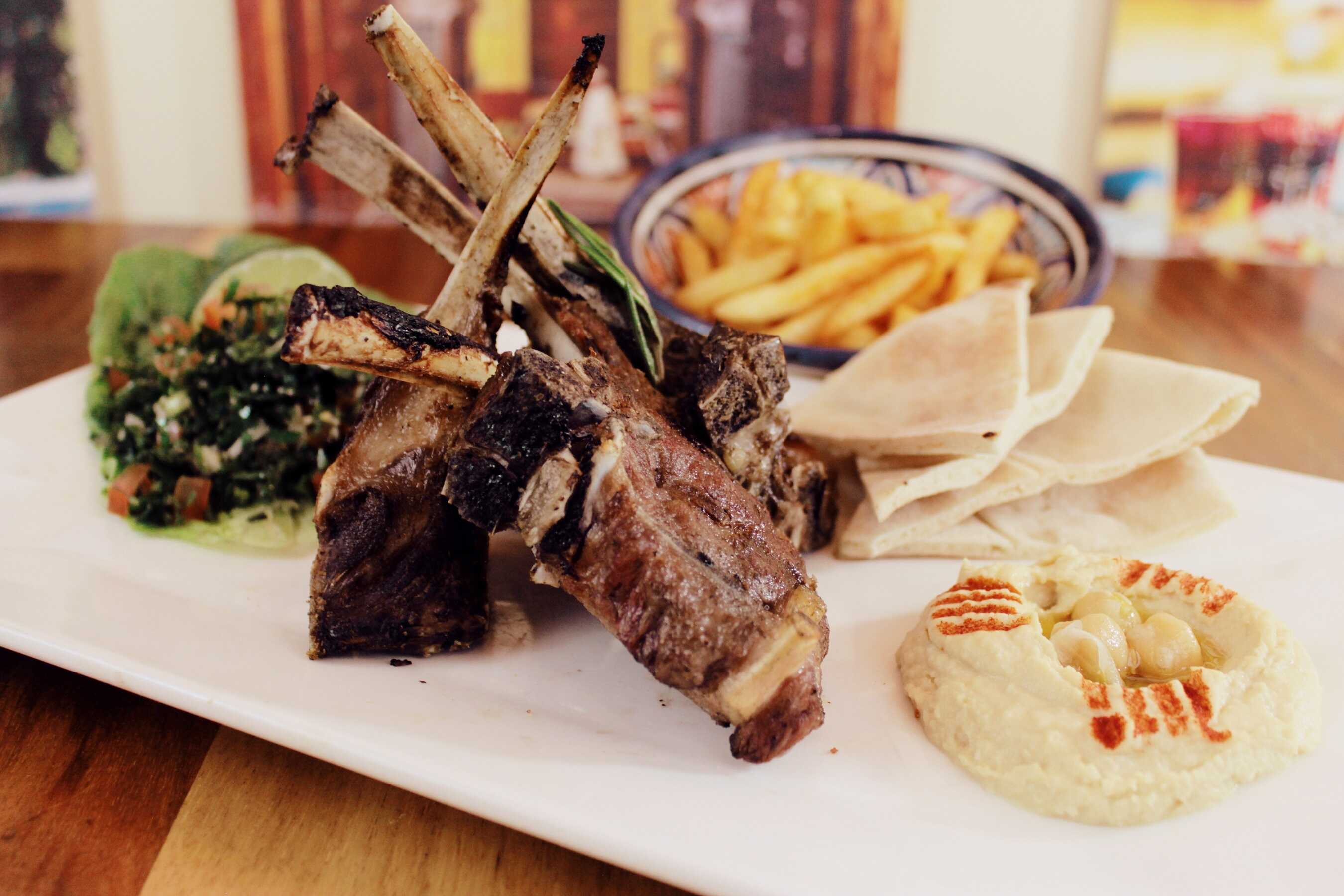 Cuatro chuletas de cordero asadas, papas fritas, hummus, pan pita y ensalada marroquí.