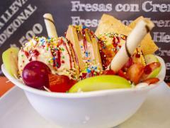 Fruta variada picada, crema de leche, queso rallado, 1 bola de helado.
