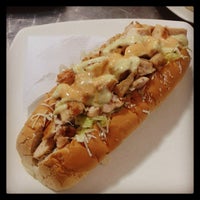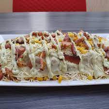 Pan, trocitos de lomo, salsa de tomate, tártara, mostaza, salchicha americana y queso