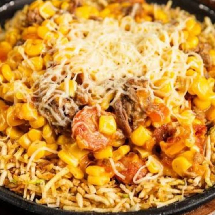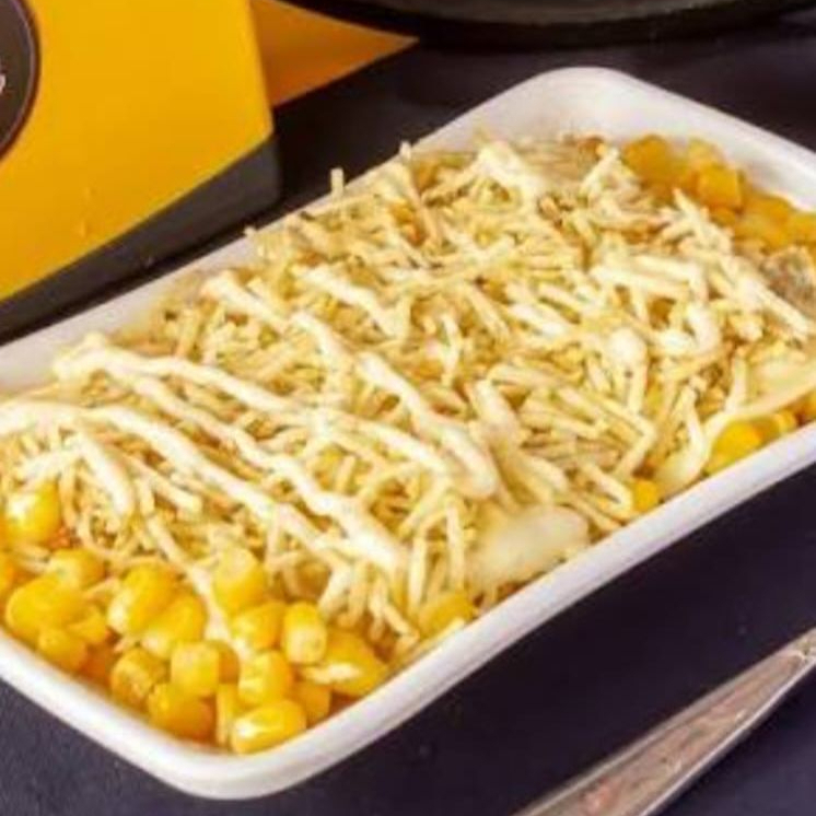 Maíz dulce desgranado, crema de leche, salchicha picada, queso gratinado, ripio de papas y salsas.