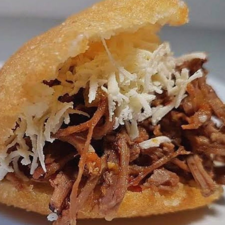 Arepa, carne desmechada y queso rallado.