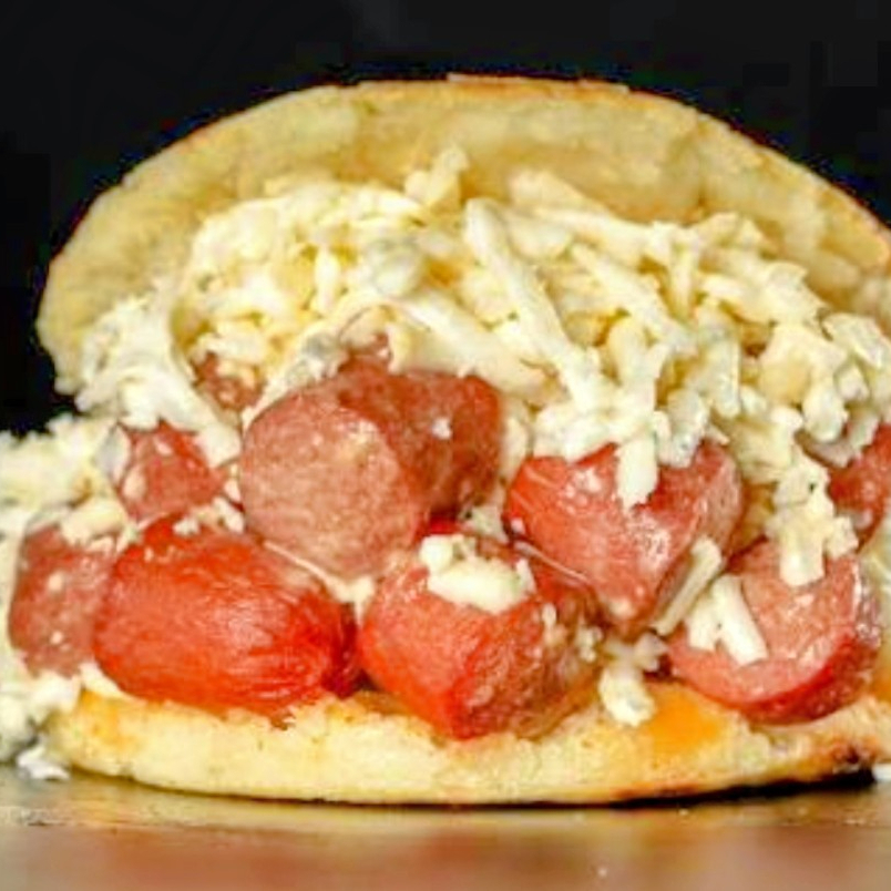 Arepa, salchicha, mayonesa y queso rallado.