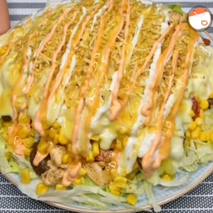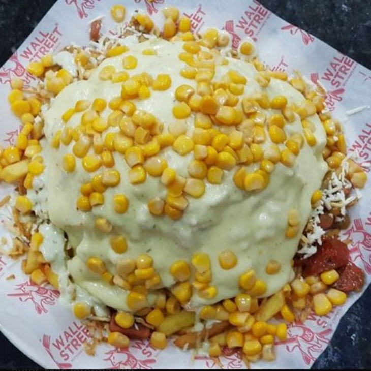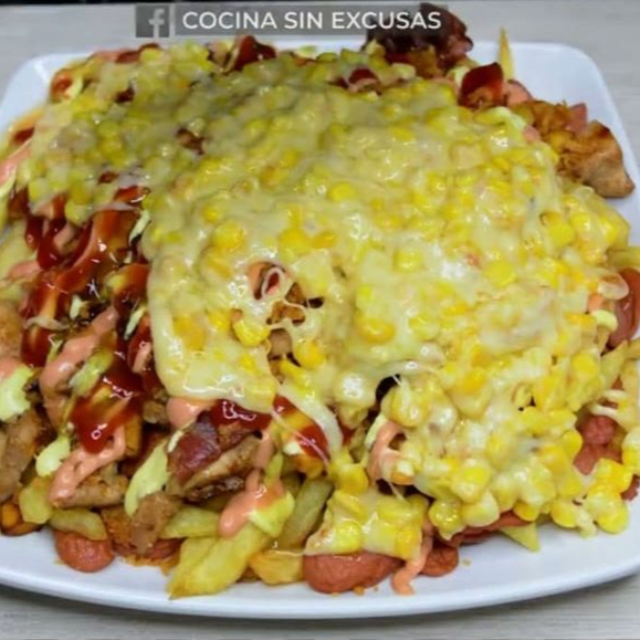 Maíz dulce desgranado, crema de leche, salchichas picadas, queso rallado, ripio de papas y salsas.