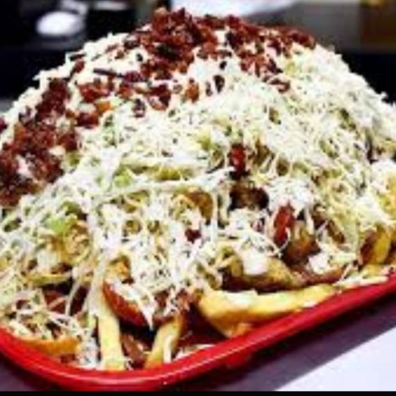 Papas a la francesa, papa criolla, carne desmechada de res y pollo, tocineta, salchichas, queso derretido y salsas.