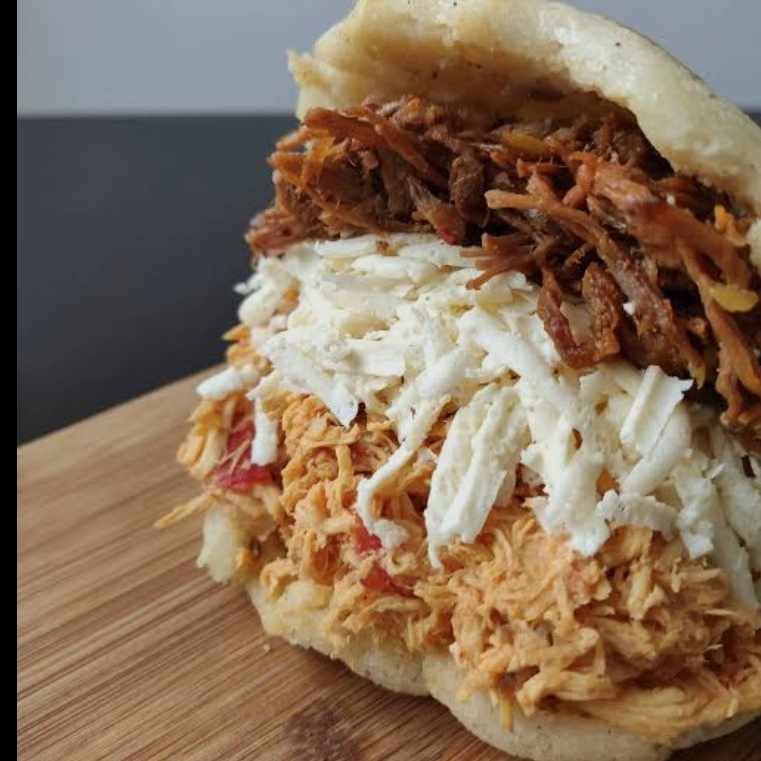 Arepa, carne desmechada, pollo desmechado y queso rallado.