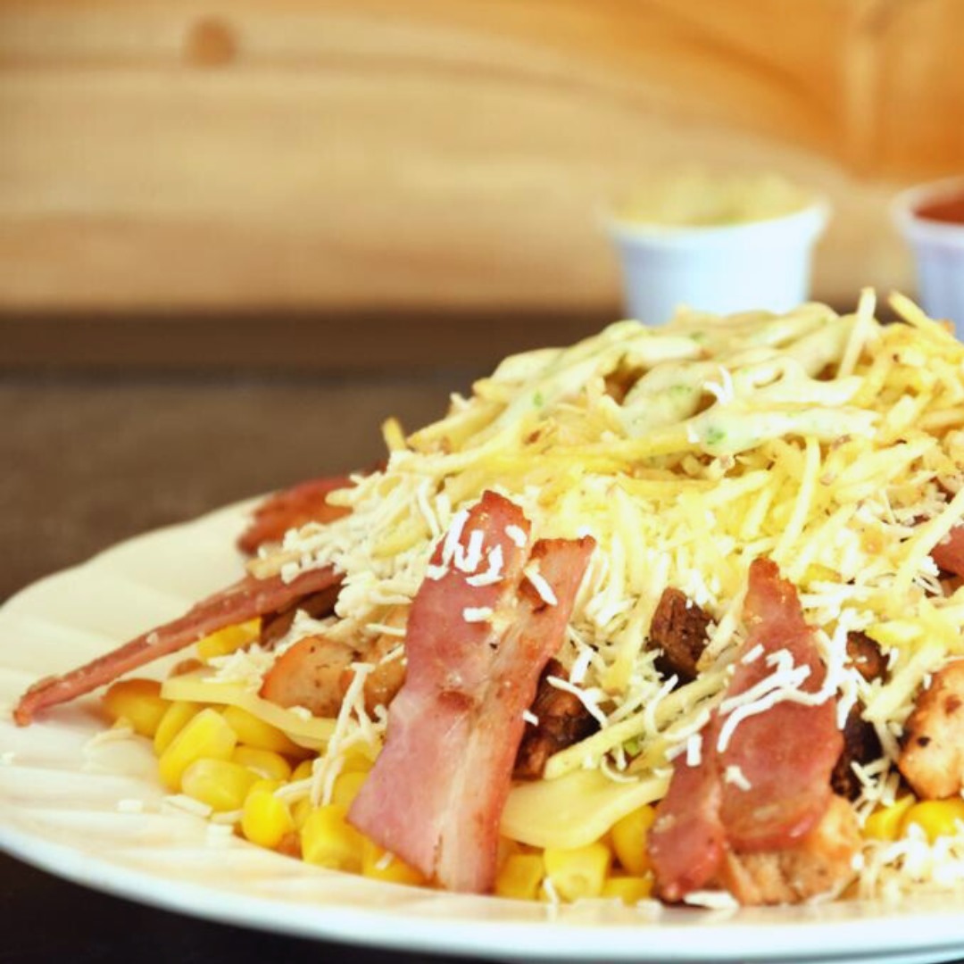 Pollo desmechado, tocineta, maíz tierno, papas cabello de ángel, cebolla, queso gratinado y salsas.