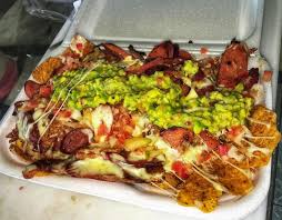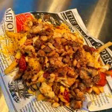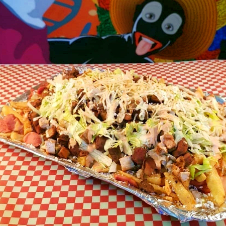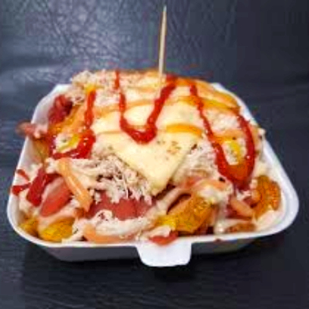 Papas artesanales, carne y pollo, salchicha americana, queso y salsas.