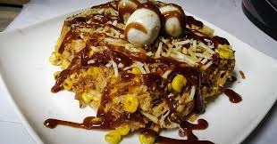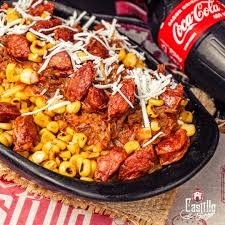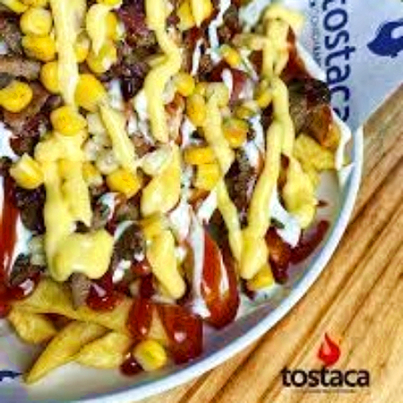Carne desmechada, chorizo, maíz tierno, papas cabello de ángel, cebolla, queso gratinado y salsas.