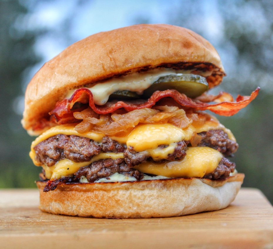 Pan artesanal, carne 100% artesanal, tocineta crujiente, queso, cebolla grille, salsas de la casa y pepinillos.