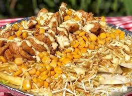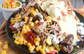 Carne a la plancha bañada en salsa búfalo, tocineta, maíz tierno, papas cabello de ángel, cebolla, queso gratinado y salsa.