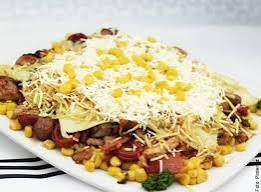 Pollo, carne desmechada, maíz tierno, papas cabello de ángel, cebolla, queso gratinado y salsas.