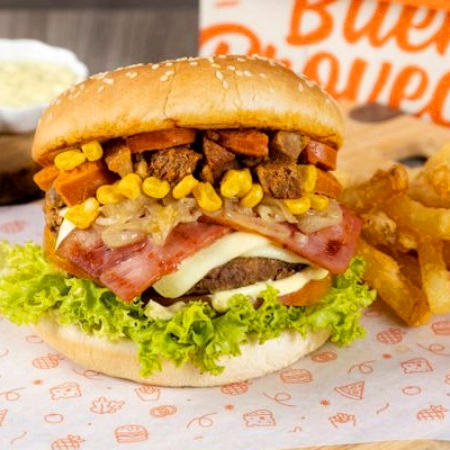 Pan tostado con mantequilla, carne artesanal, maíz dulce, tocineta crujiente, chorizo ahumado, queso mozarella, papas chips, salsas de la casa, papas francesas.