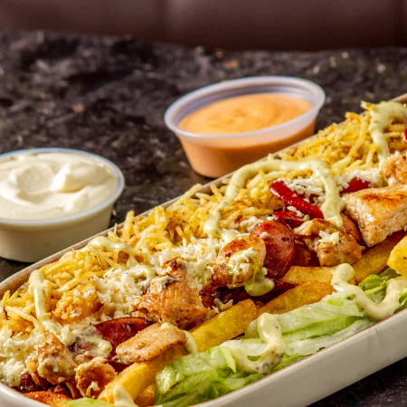 Papas artesanales, carne y pollo a la plancha en trozos, chorizo, salchicha americana, queso y salsas.