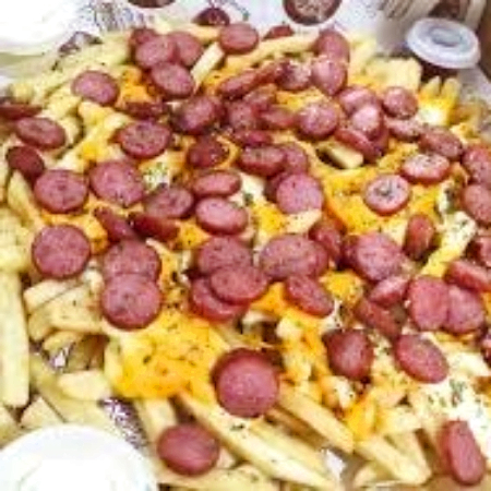Papas artesanales, carne a la plancha en trozos, salchicha americana, queso y salsas.