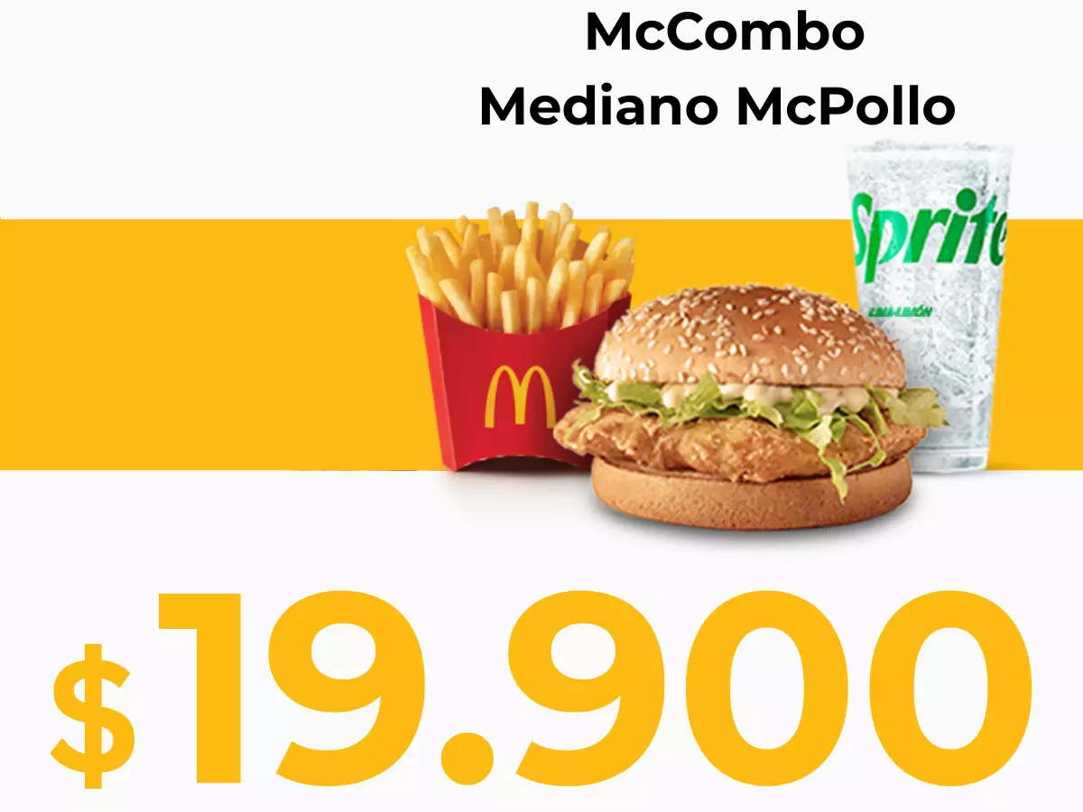 Elige tu McCombo con hamburguesa de 100% pechuga de pollo de 125gr, salsa especial, lechuga, tomate y cebolla grillada 100% colombianos y queso blanco con papas medianas y gaseosa mediana a elegir.