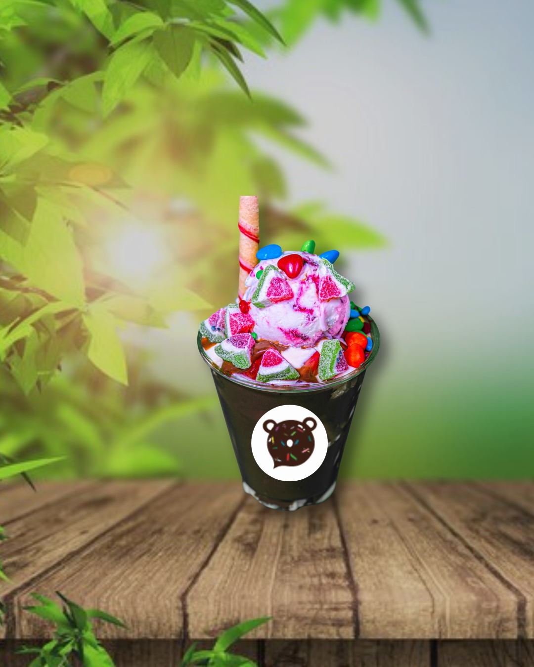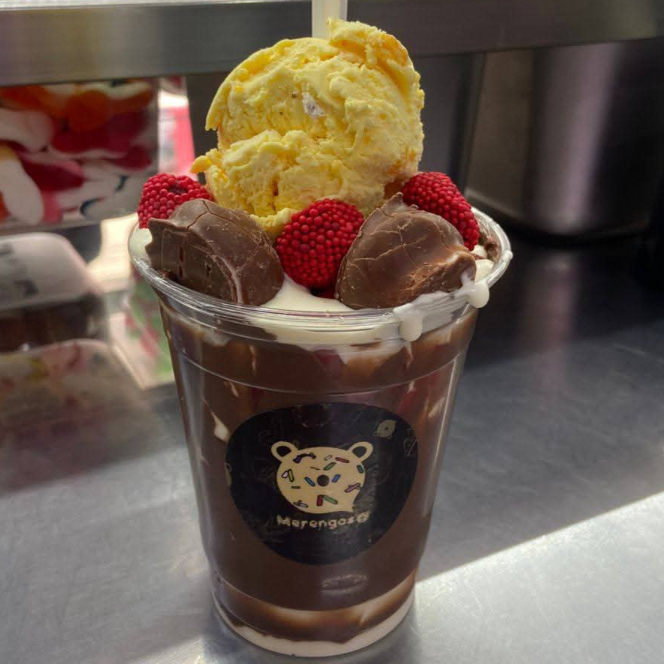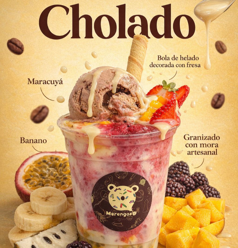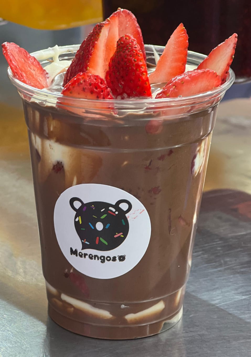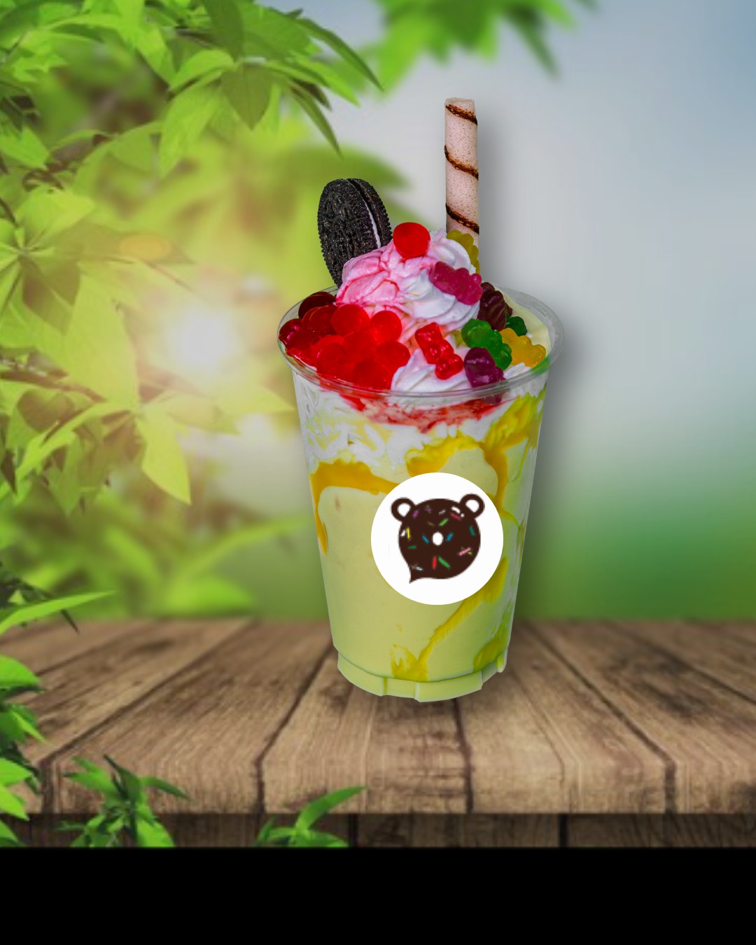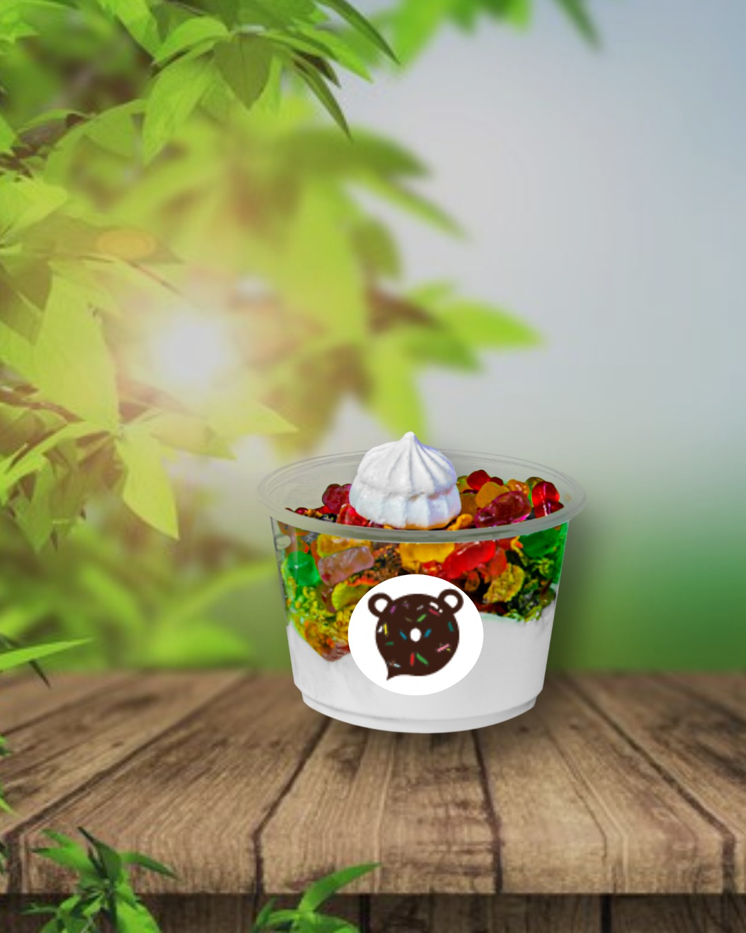 Base de merengue con crema de leche, salsa de mora, tres frutas a elección, cuatro toppings, una bola de helado y un suspirito decorativo, servido en vaso de 32 onzas.