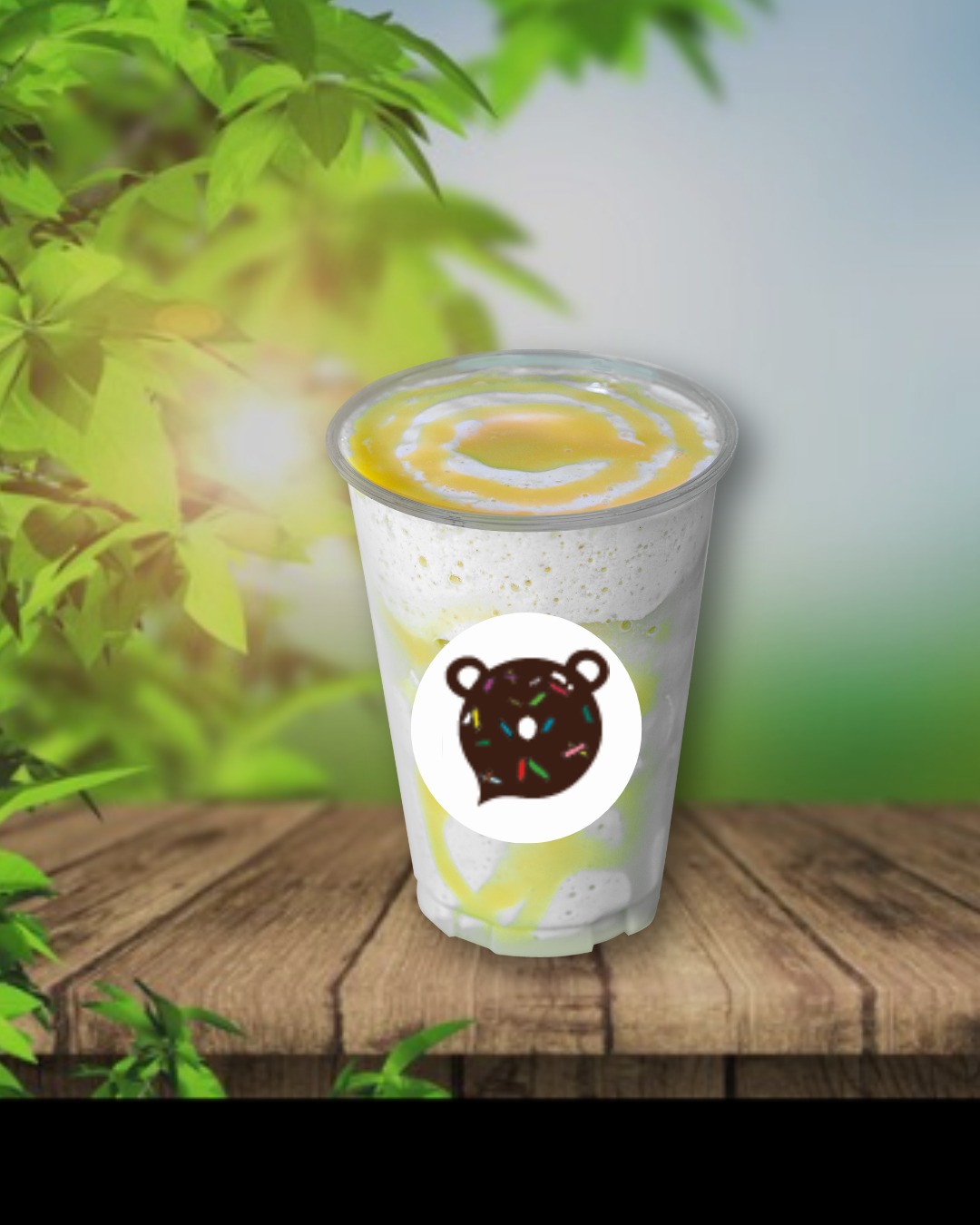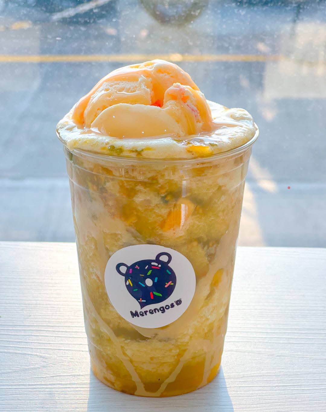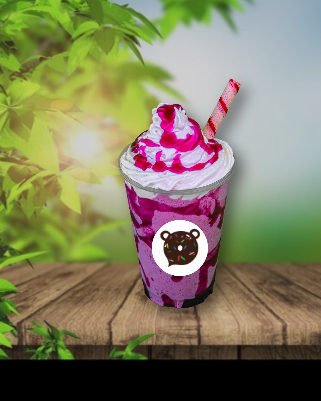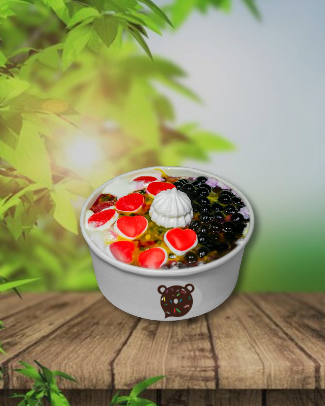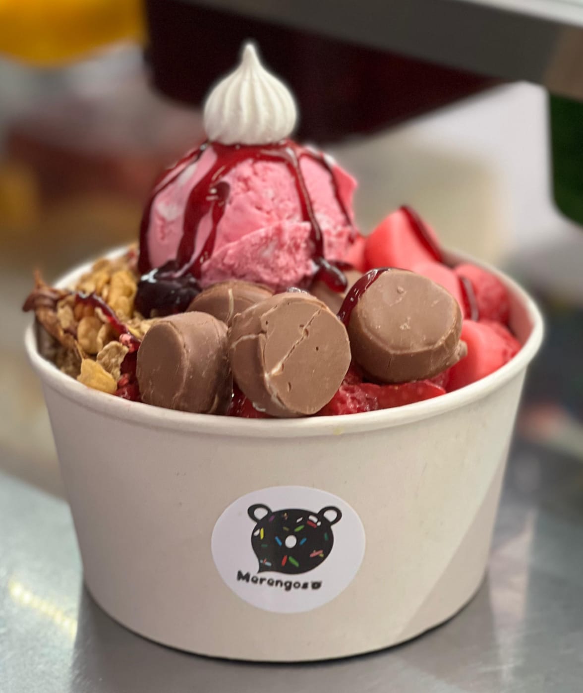 Base de merengue con crema de leche, salsa de mora, tres frutas a elección, cuatro toppings, una bola de helado y un suspirito decorativo, servido en vaso de 32 onzas.