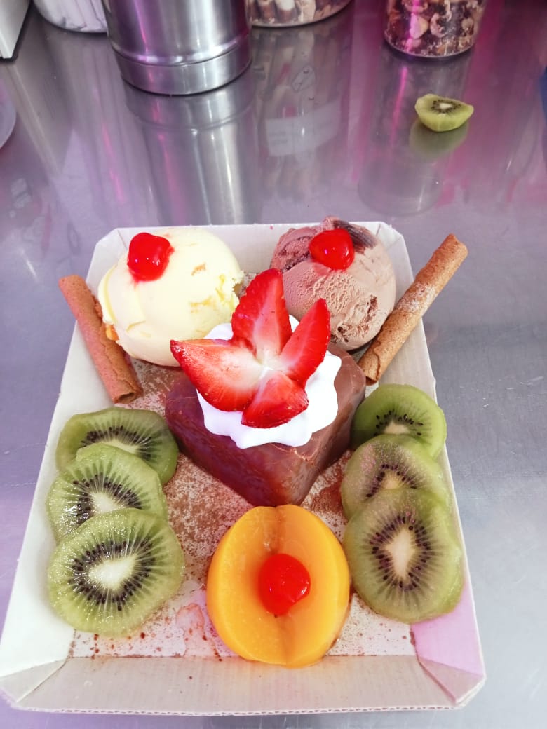 Brownie con helado de vainilla chips y brownie, decorado con durazno, kiwi, fresa y cereza.