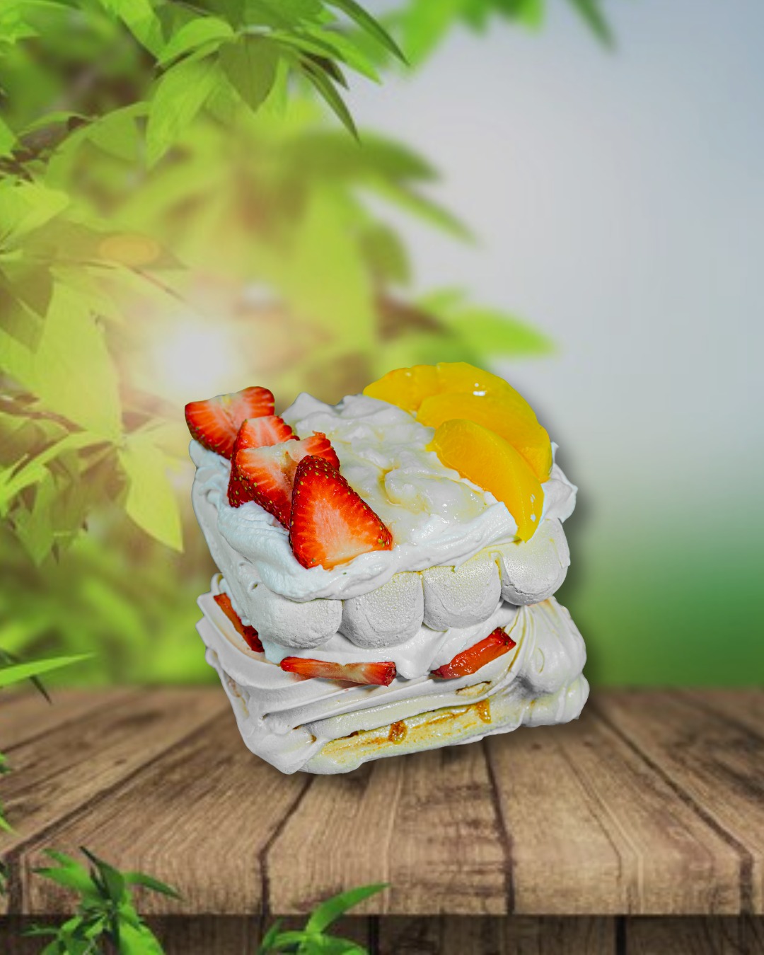 Base de merengue, crema de leche, salsa de mora, 3 frutas, 2 toppings y un suspirito de decoración.