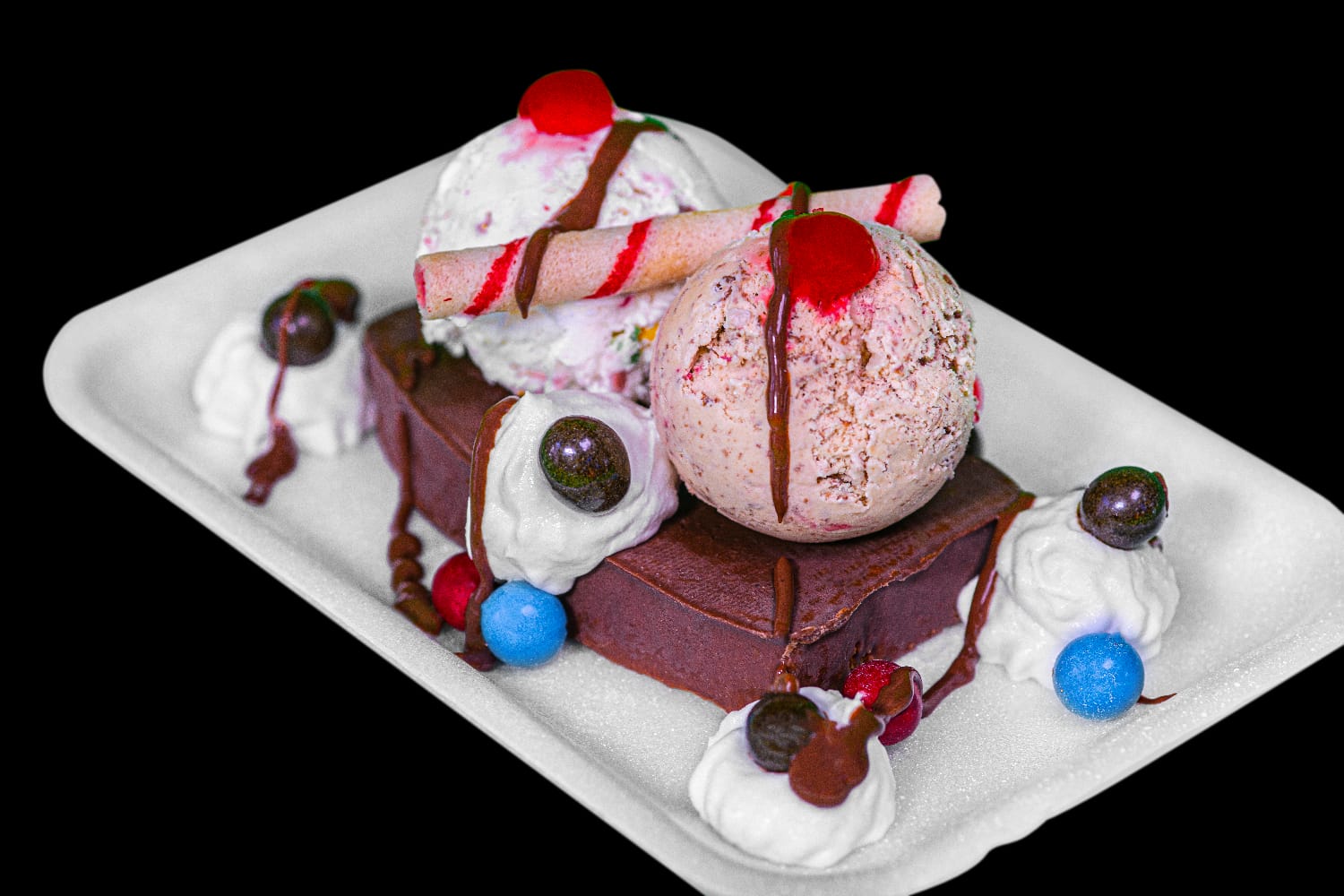 Base de crema de leche o chocolate y arequipe, con helado de vateado de mora, brownie y frutos rojos, decorado con fresa, Iluvia de chocolate.