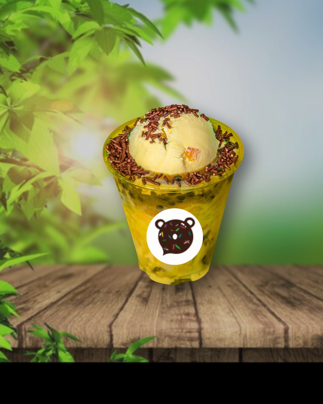 Vaso con pulpa de maracuyá y mango, con helado de maracuyá decorado con leche condensada y palitos de chocolate.