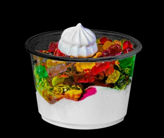 Base de merengue, crema de leche, salsa de mora, 3 frutas, 4 toppings, 1 bola de helado y un suspirito de decoración.