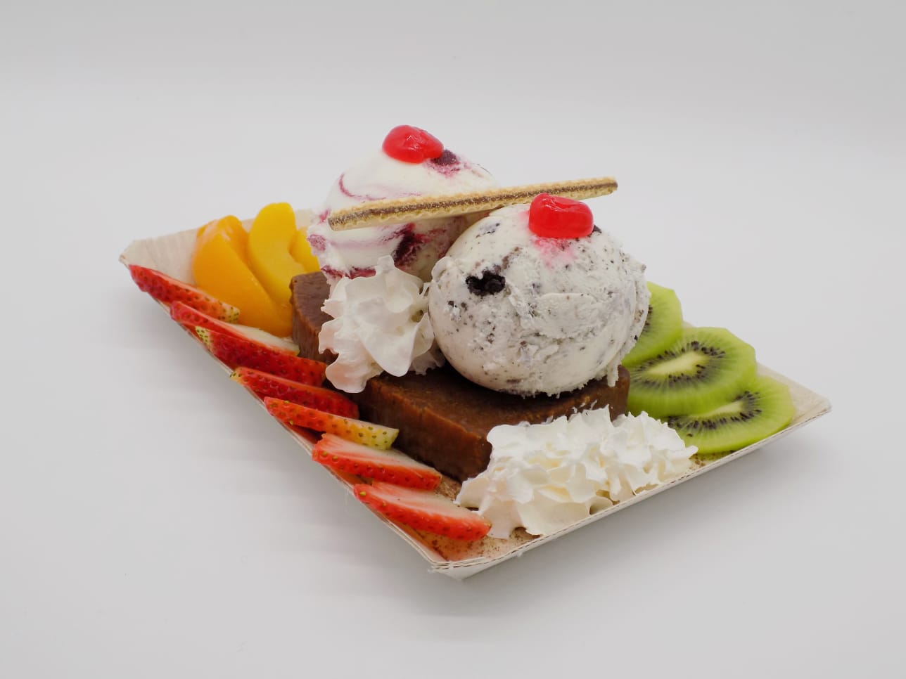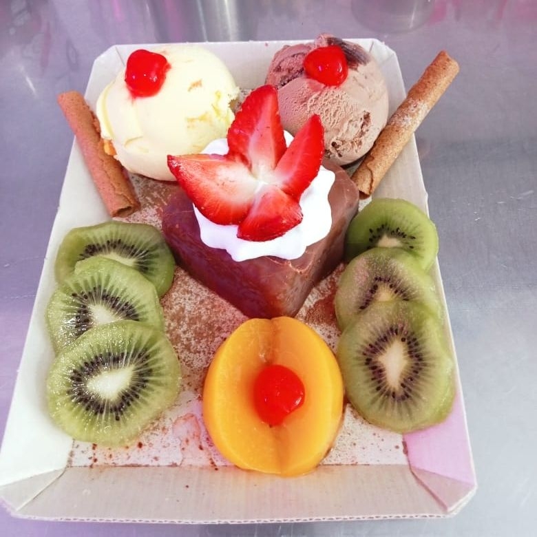 Brownie con helado de vainilla chips y brownie, decorado con durazno, kiwi, fresa y cereza.