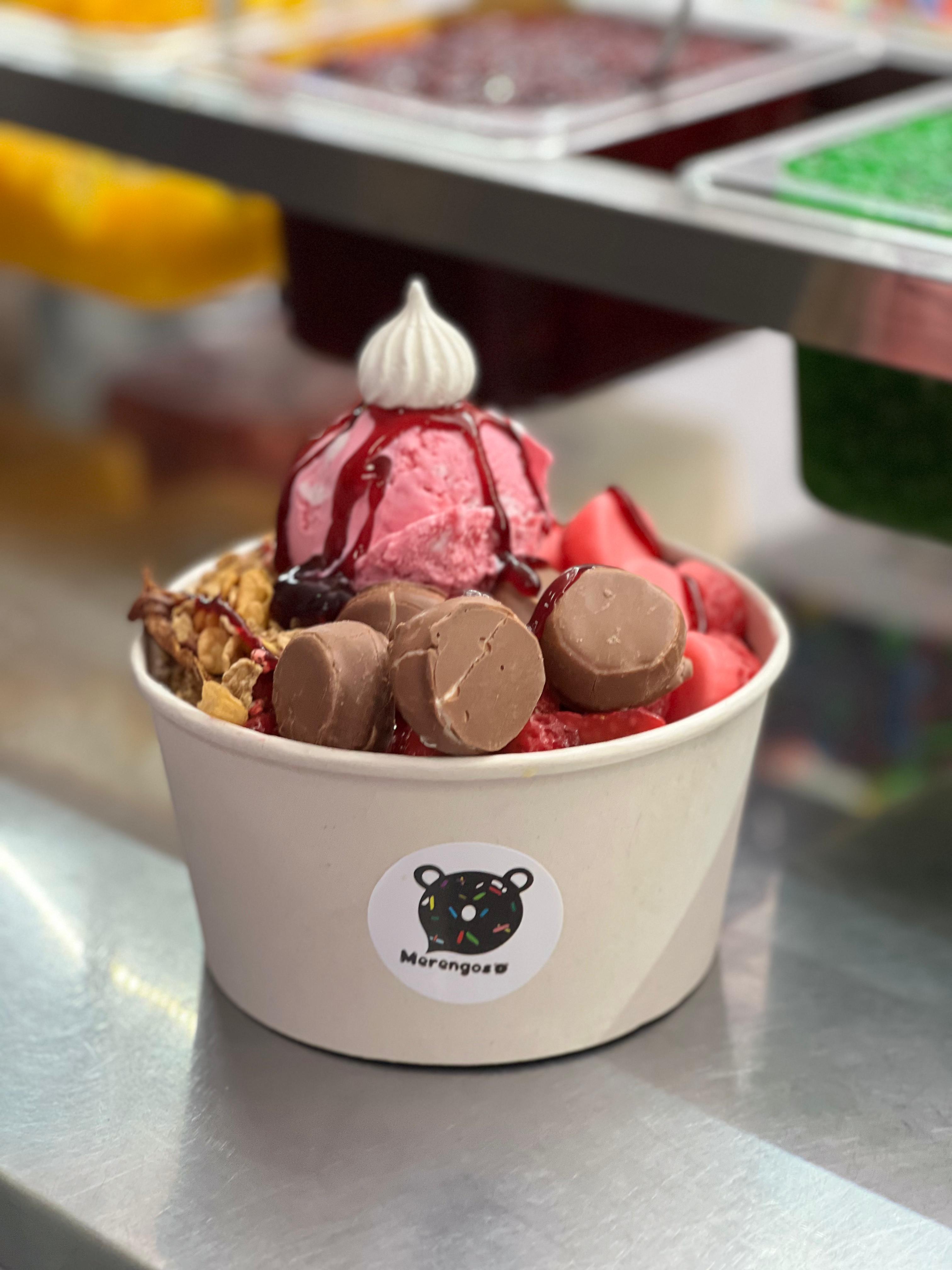 Merengón Agrandado: Base de merengue, crema de leche, salsa de mora, 3 frutas, 4 toppings, 1 bola de helado y un suspirito de decoración. + Fresas con Toppings: Fresas con nutella, crema de leche, chantilly, 2 toppings y 1 barquillo. + Fresas con Helado: Fresas con nutella, crema de leche y 1 bola de helado.