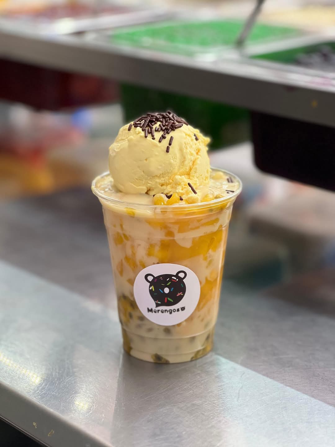 Merengón Personal: Base de merengue, crema de leche, salsa de mora, 3 frutas, 2 toppings y un suspirito de decoración. + Maracumango: Vaso con pulpa de maracuyá y mango con helado de maracuyá decorado con leche condensada y palitos de chocolate.
