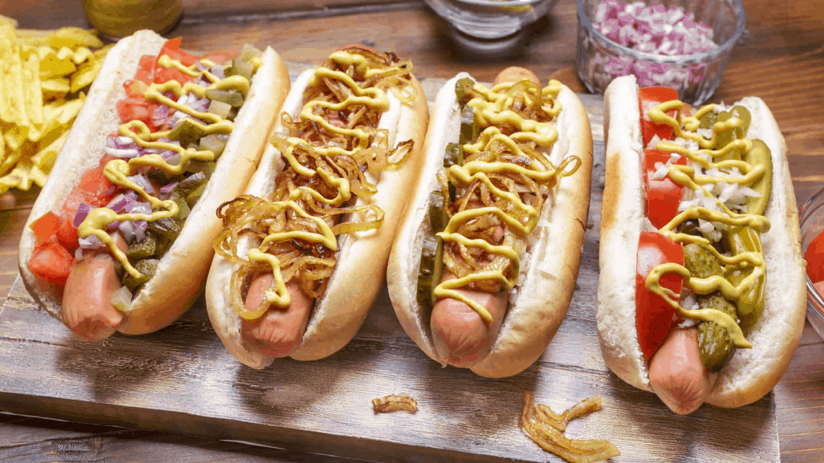 Salchicha americana, pan, cebolla, papá cabello de ángel, salsas, queso.