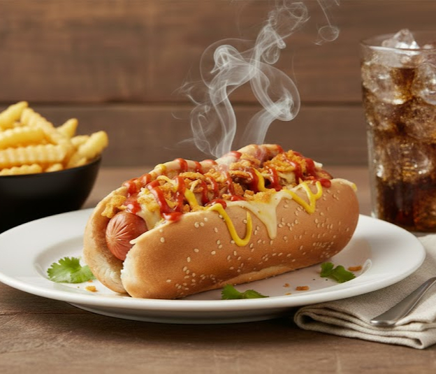 Hot dog americano, con salchicha tipo americana, queso, papa chips, salsas acompañado de papas a la francesa y gaseosa 250ml