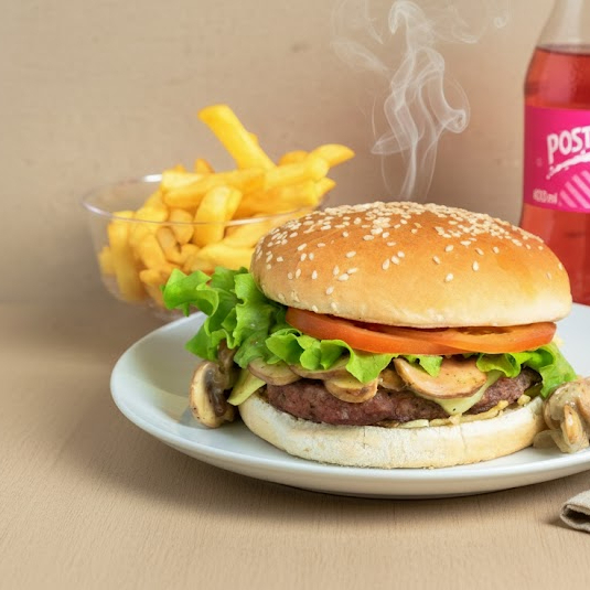 Hamburguesa clasica personal, acompañada de papas a la francesa y gaseosa postobon 250m