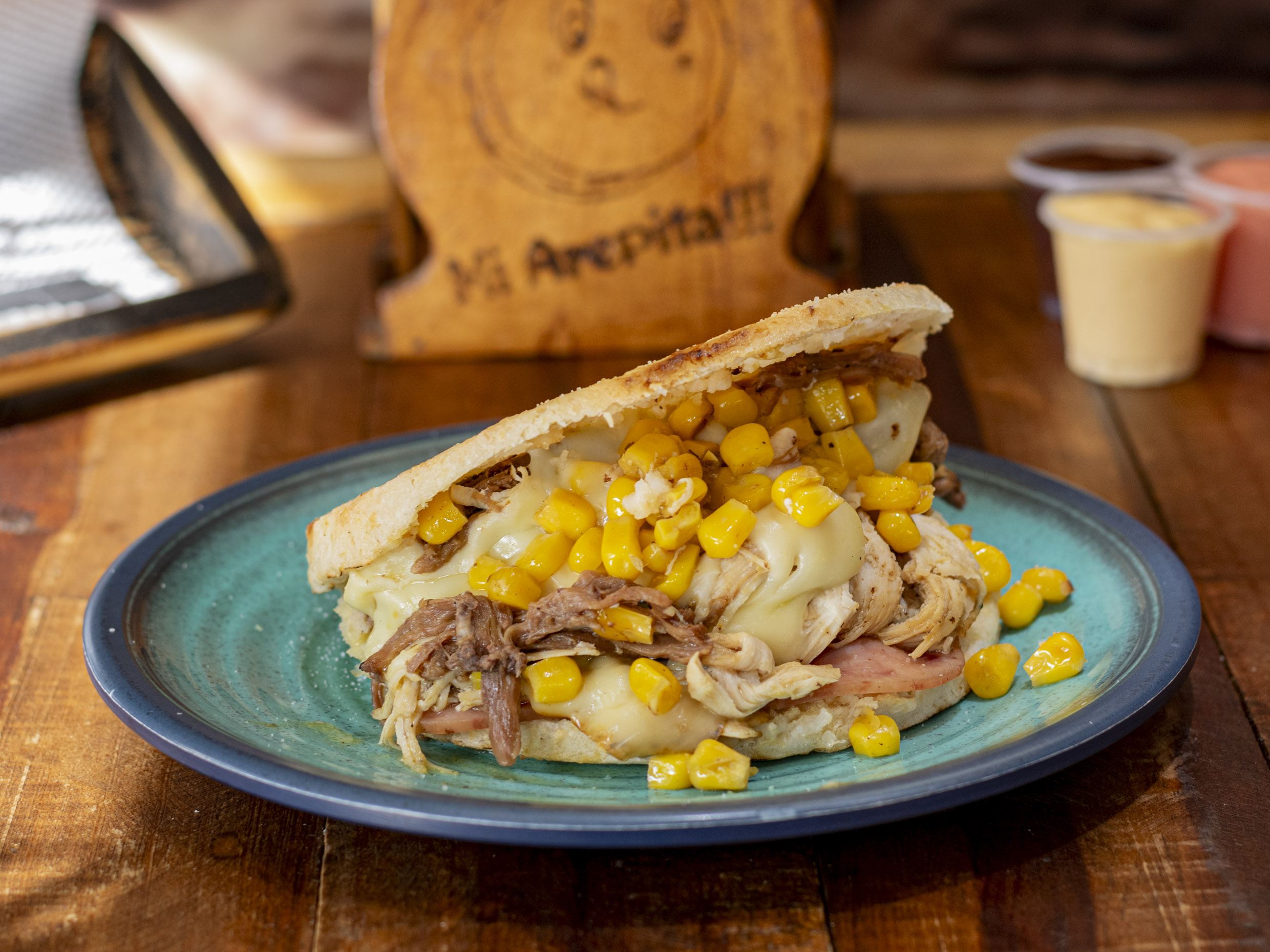 Arepa rellena carne, pollo, jamón, maíz y queso.