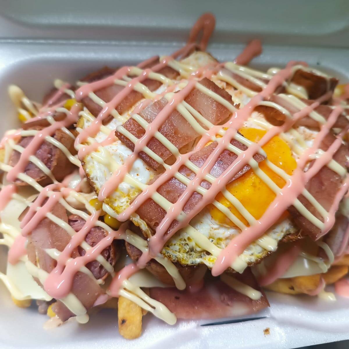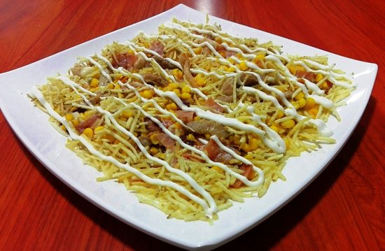 Carne, pollo, maíz, doble tocineta, chorizo, papa a la francesa, crema de leche y doble queso.