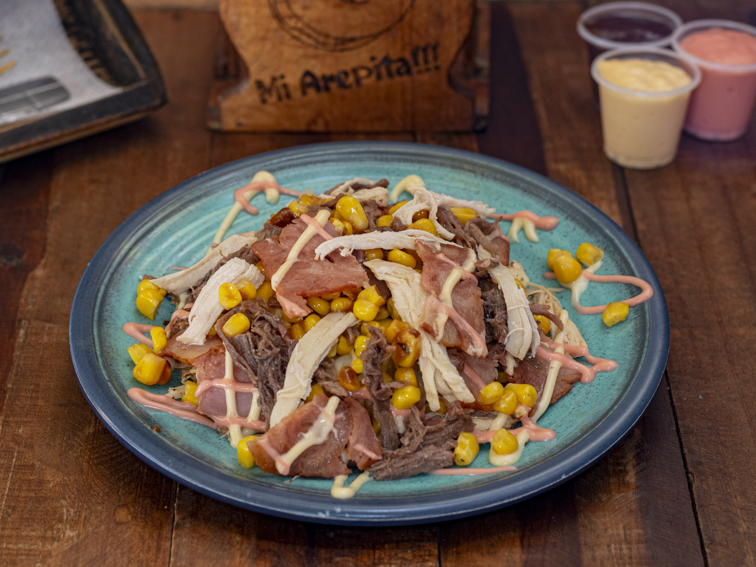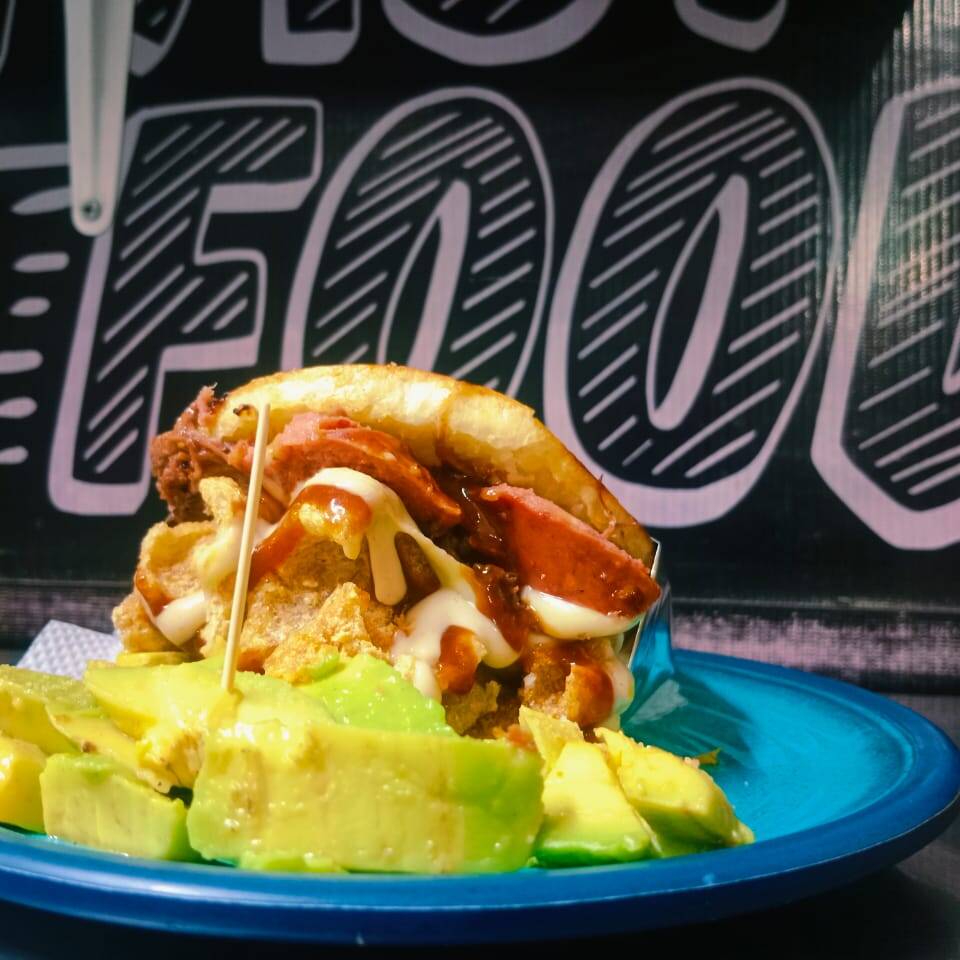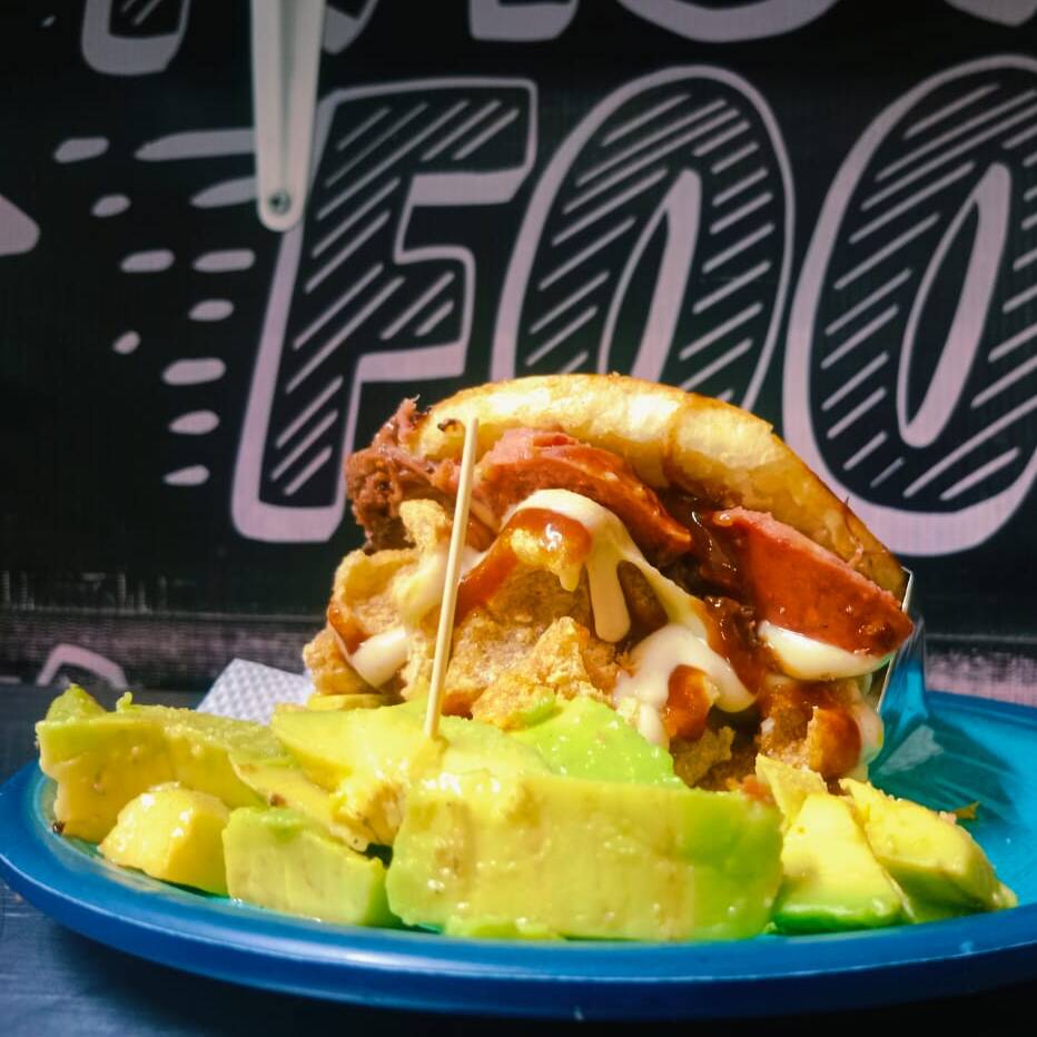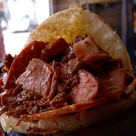 Arepa rellena carne mechada, chorizo, chicharrón, aguacate y queso.