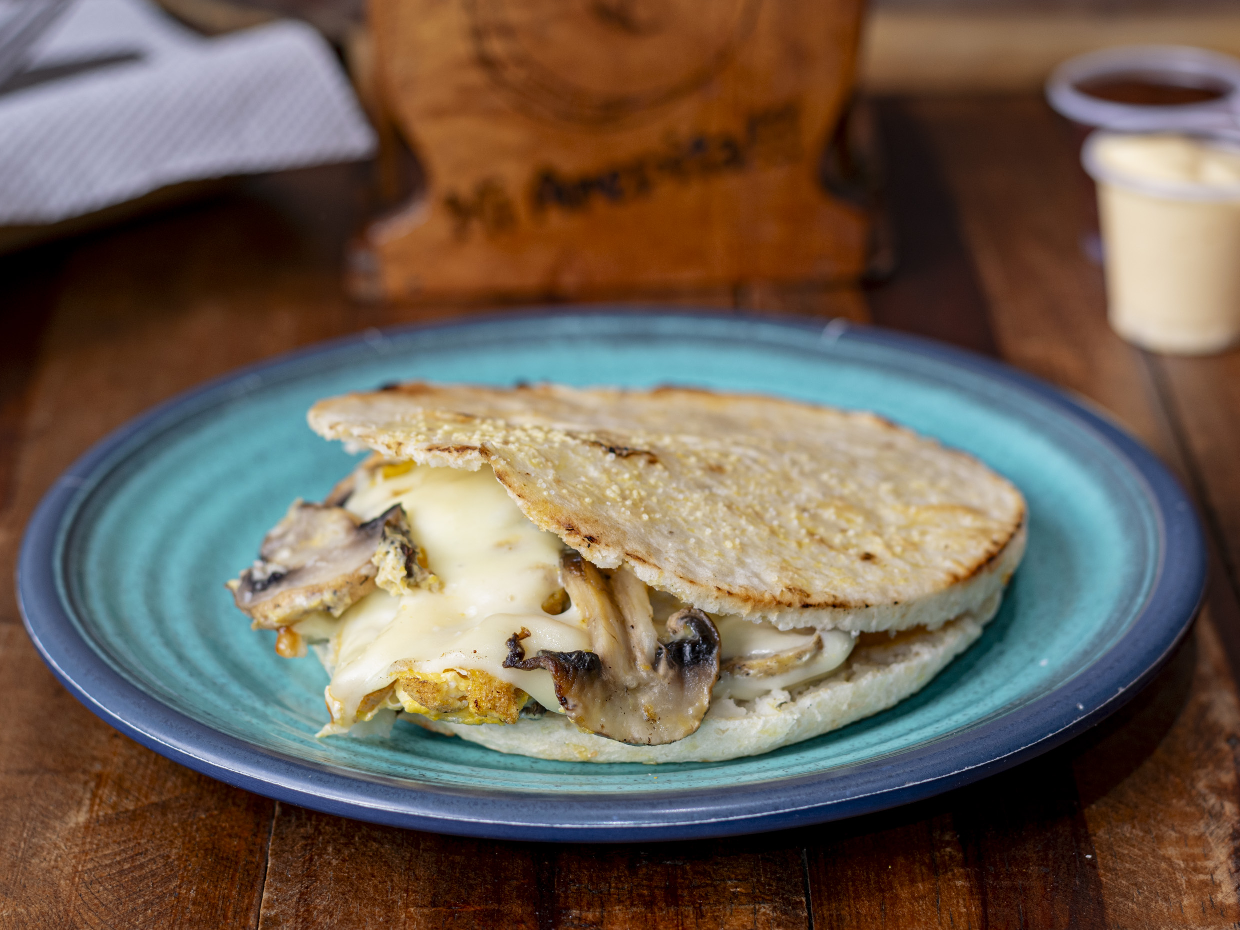 Arepa rellena, huevo, champiñón y queso.