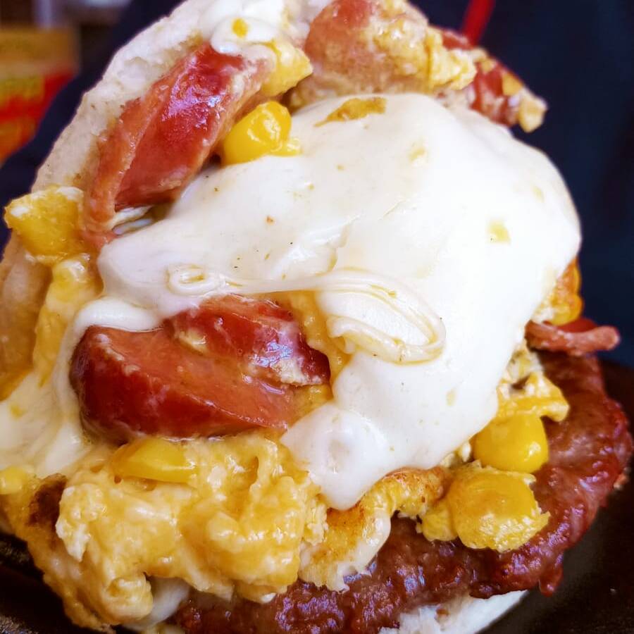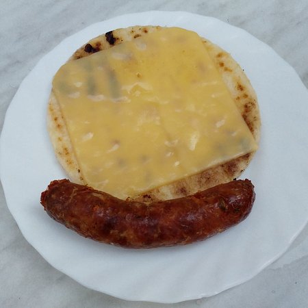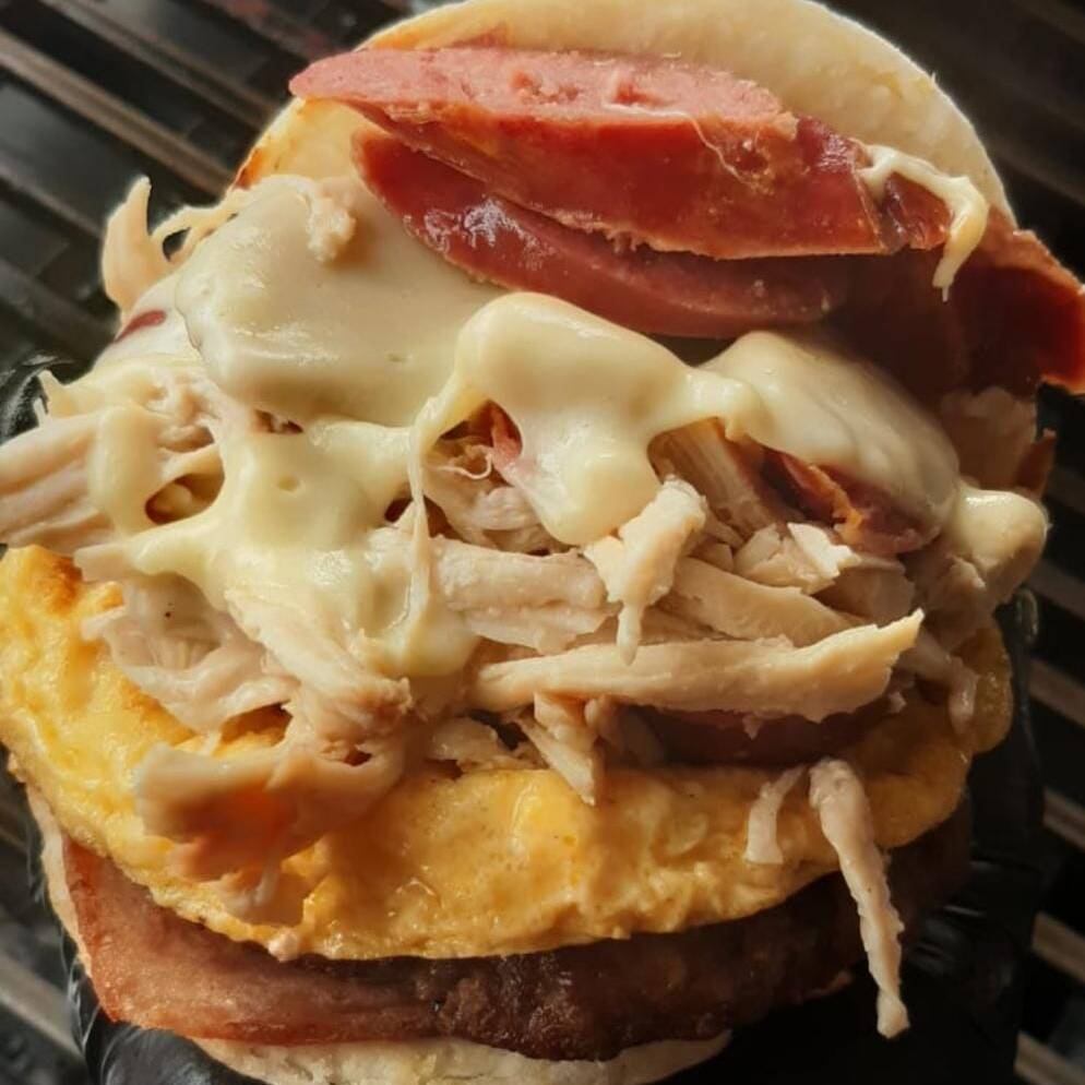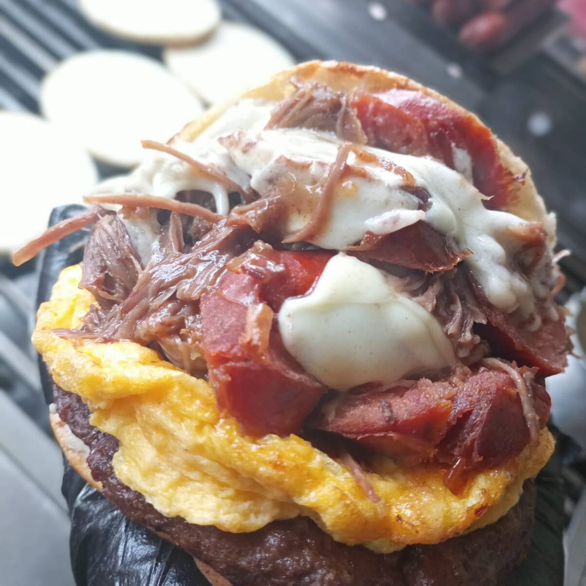 Arepa, carne de hamburguesa, 2 huevos, maíz, 2 quesos y chorizo.