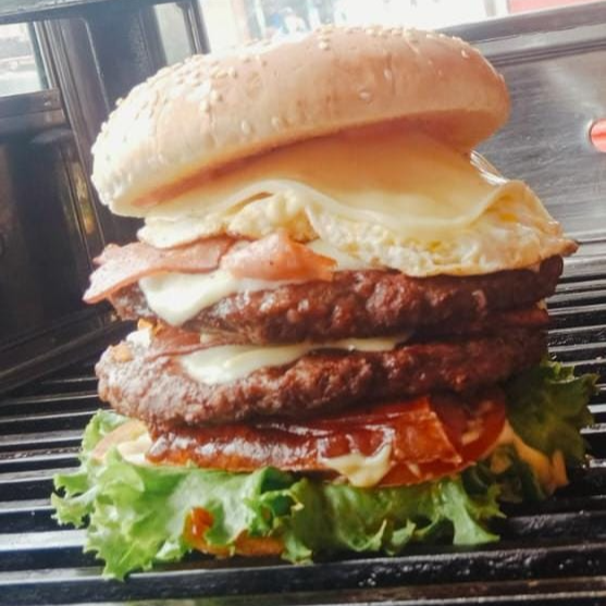 Pan de hamburguesa, doble carne artesanal, doble tocineta, triple queso mozzarella, chorizo, huevo frito, cebolla crujiente, lechuga, tomate y salsa de la casa.